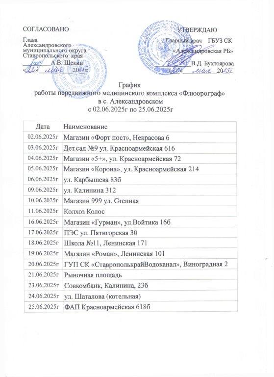 График работы передвижного медицинского комплекса "Флюрограф" в с. Александровском с 02.06.2025 по 25.06.2025